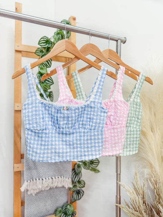 Riley Gingham Rosette Lace Trim Top