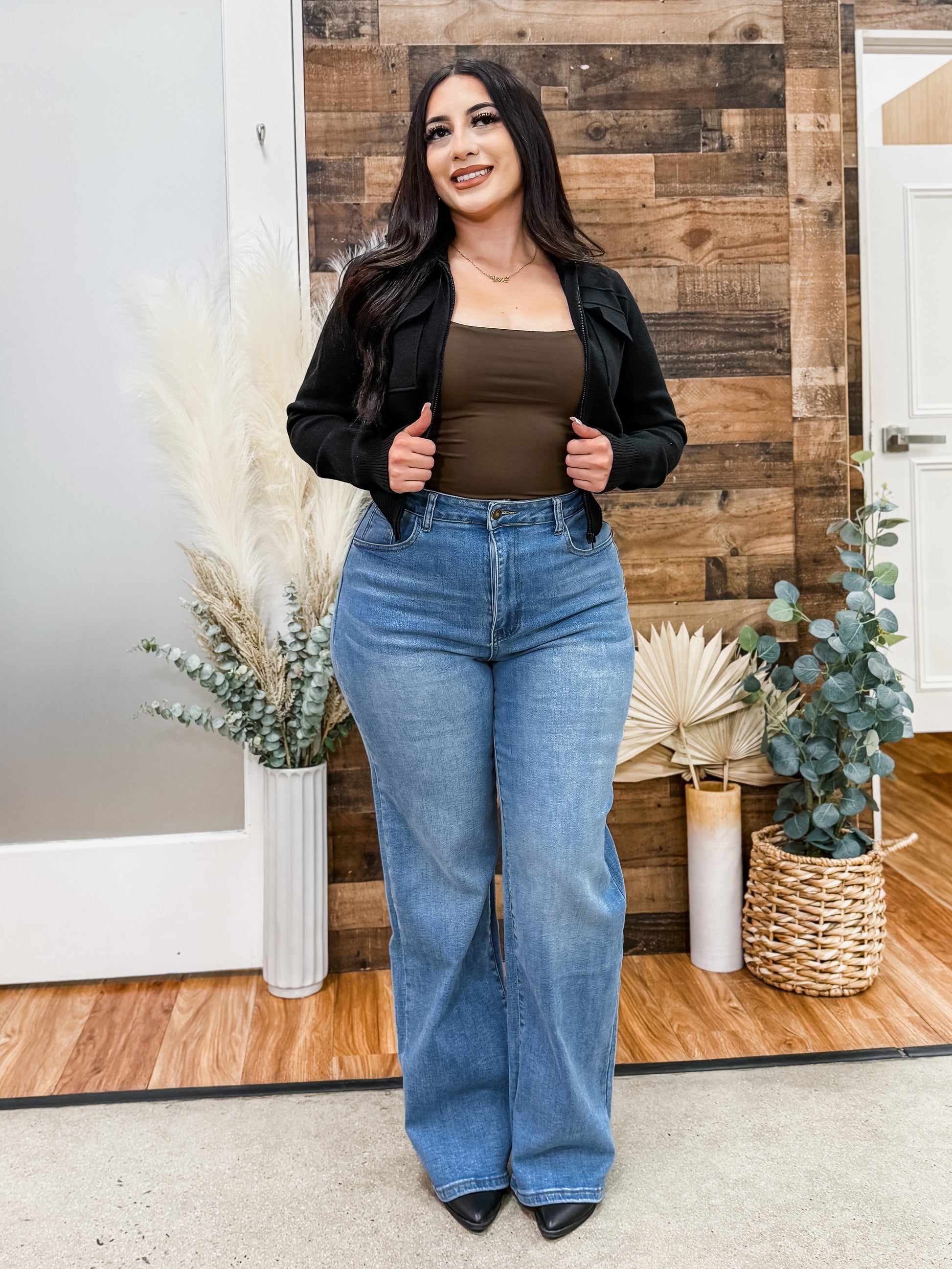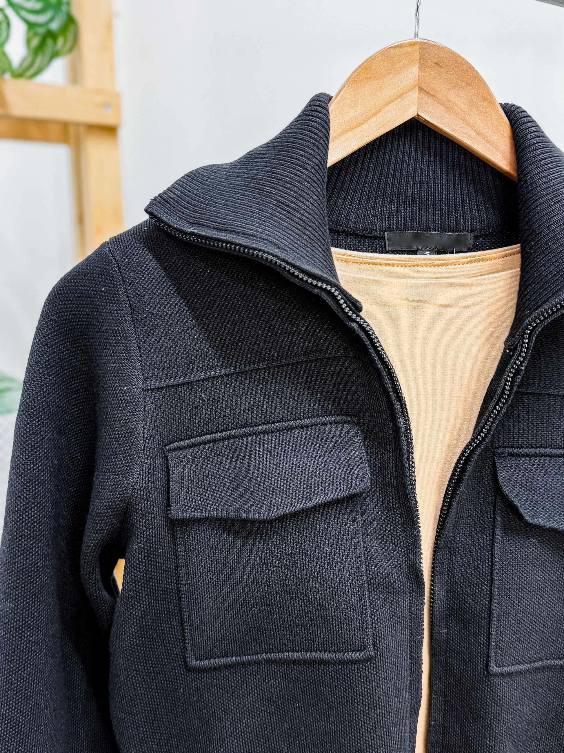 Sweater knit jacket with ribbed collar. Has front flap pockets.