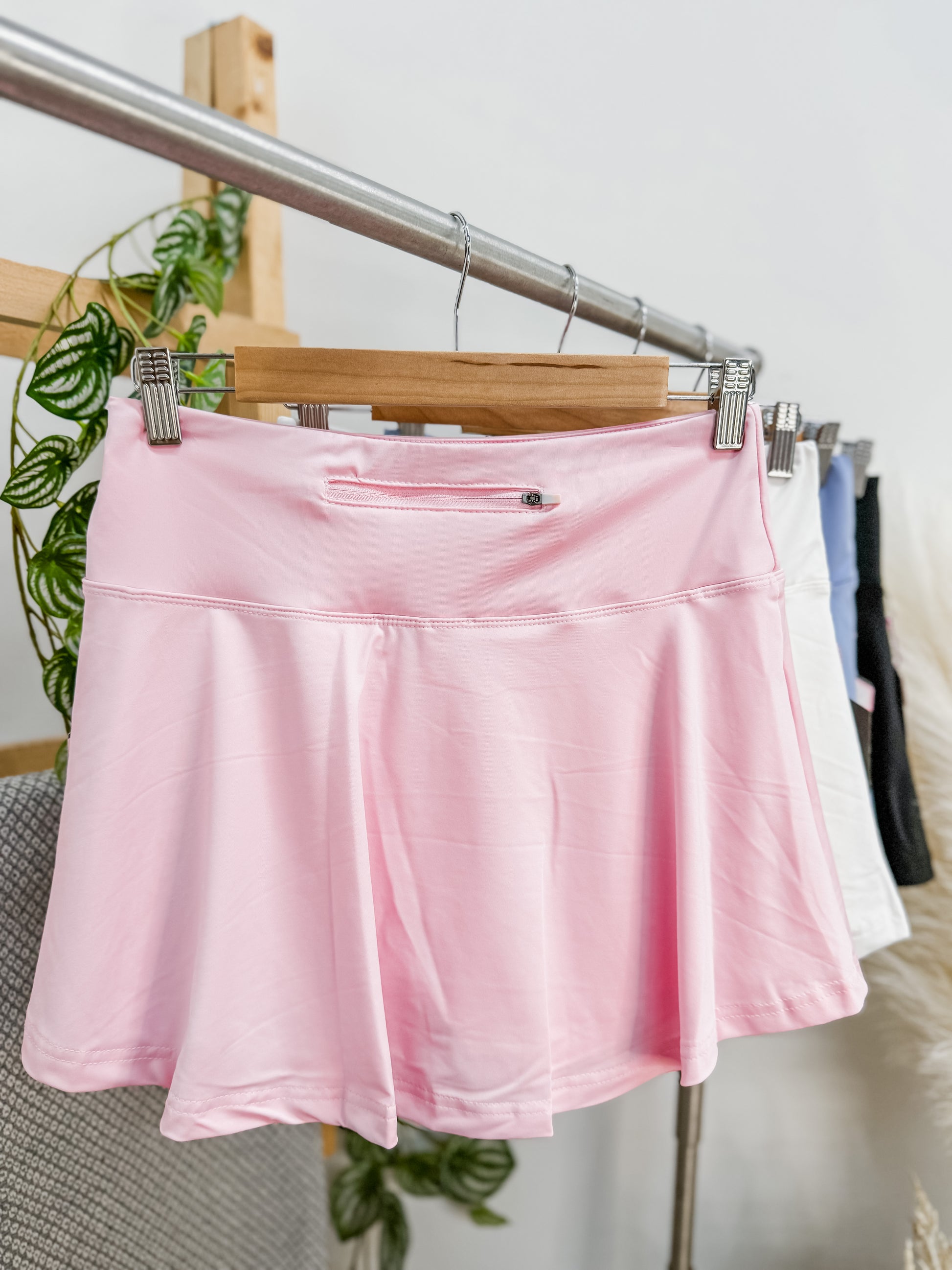 Stretch mini skirt with built in shorts. Shorts have side pocket and back zipper pocket.