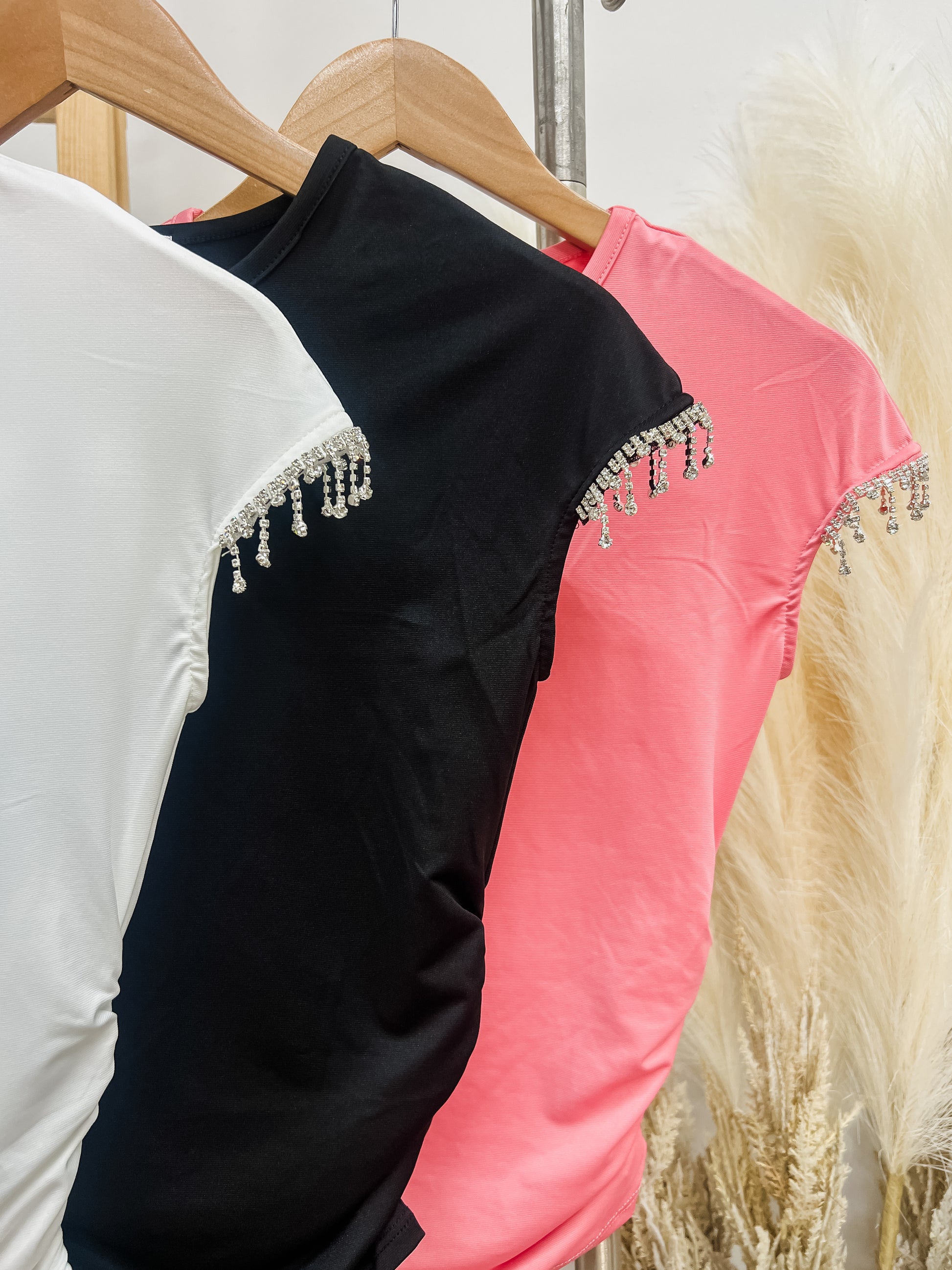 Cap sleeve top with small rhinestone fringe. Has shirring detail at sides. Stretch fabric with boat neck.