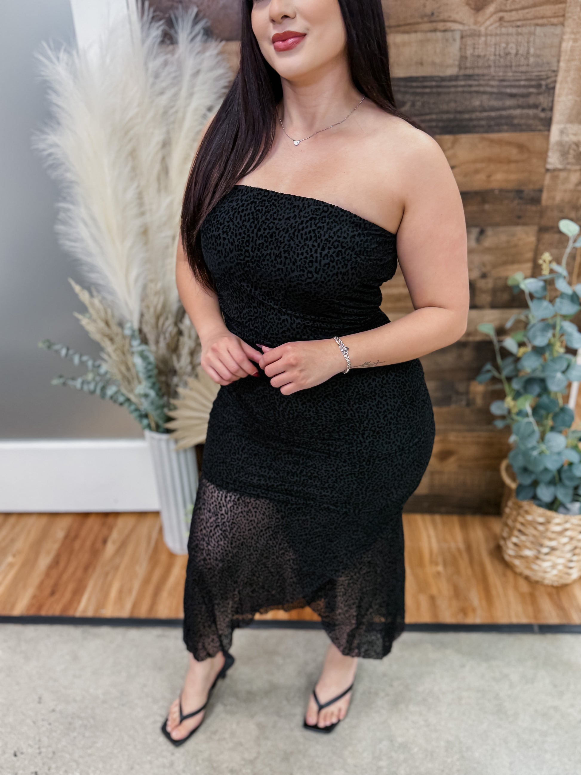 Strapless mesh midi dress with velvet burnout monochromatic fabric. Has pointed hems and sheer skirt. Side concealed zipper.