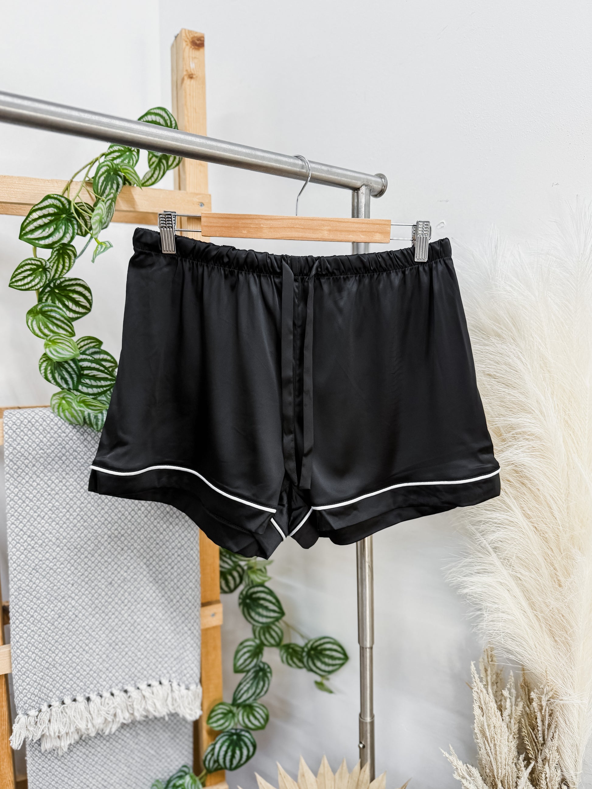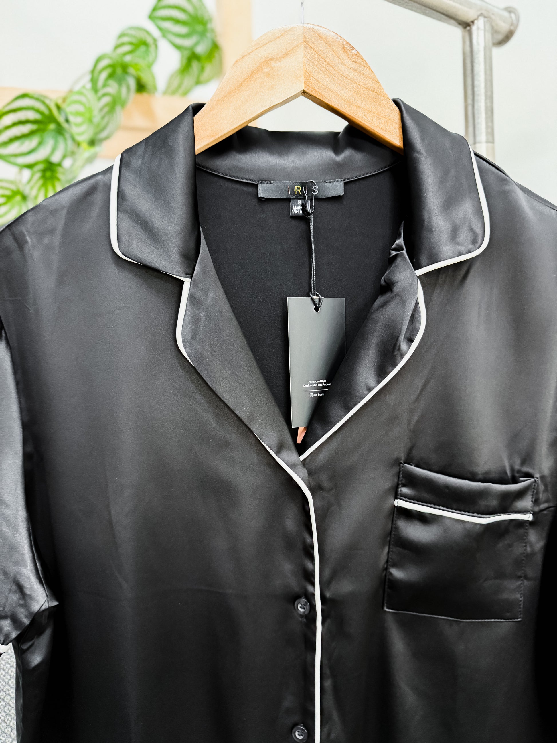 Collar silk style pajama set with contrast piping. Has square front pocket. Super soft material. Loose fitting, non stretch. Shorts has drawstring adjustable stretch waistband.