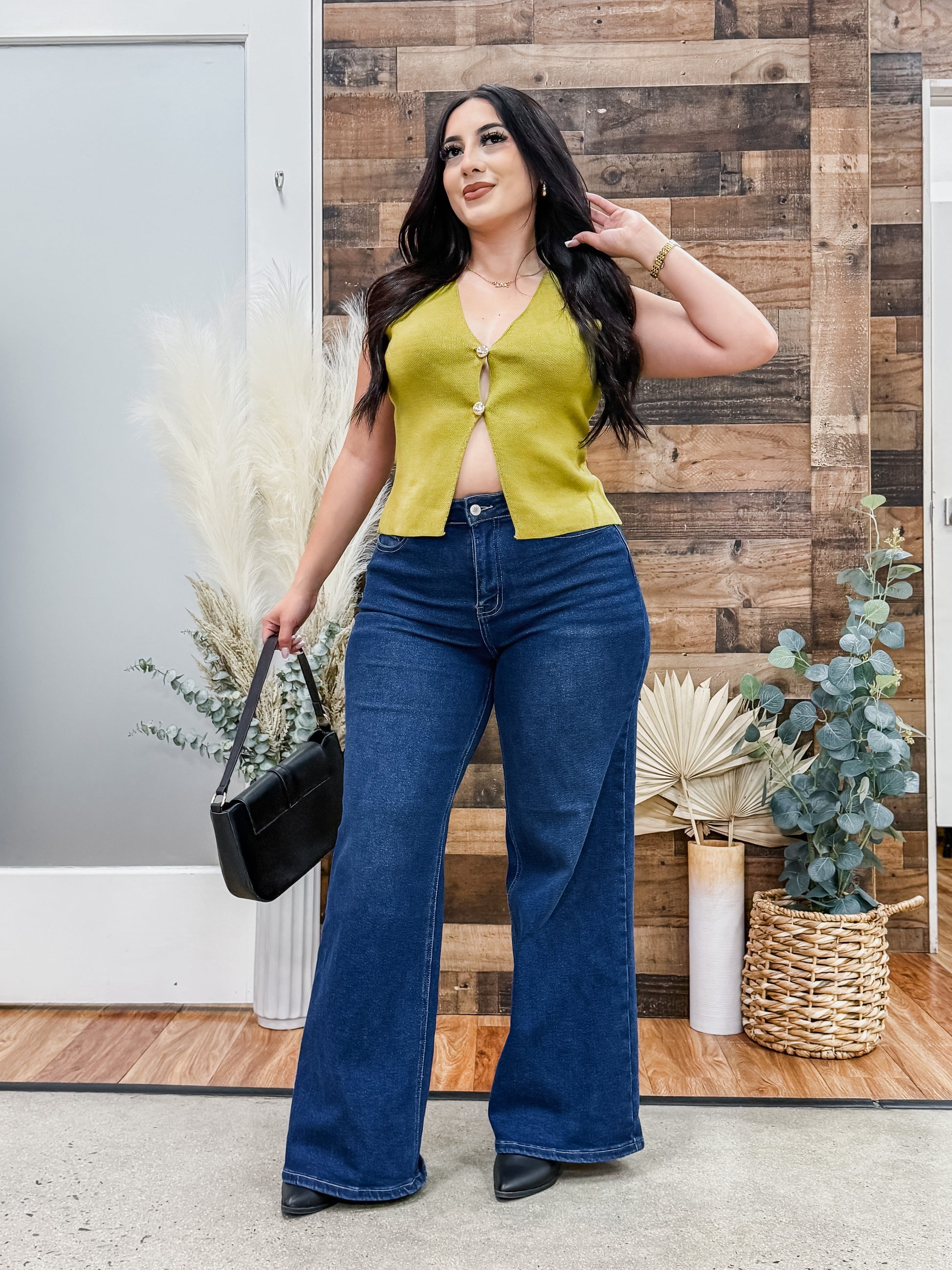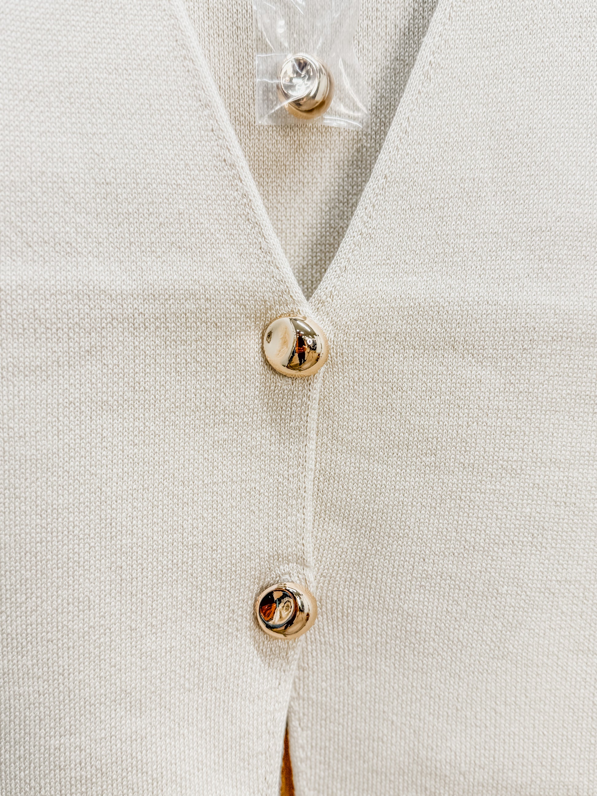 Sweater knit top with v-neck. Has 2 gold buttons down center front.