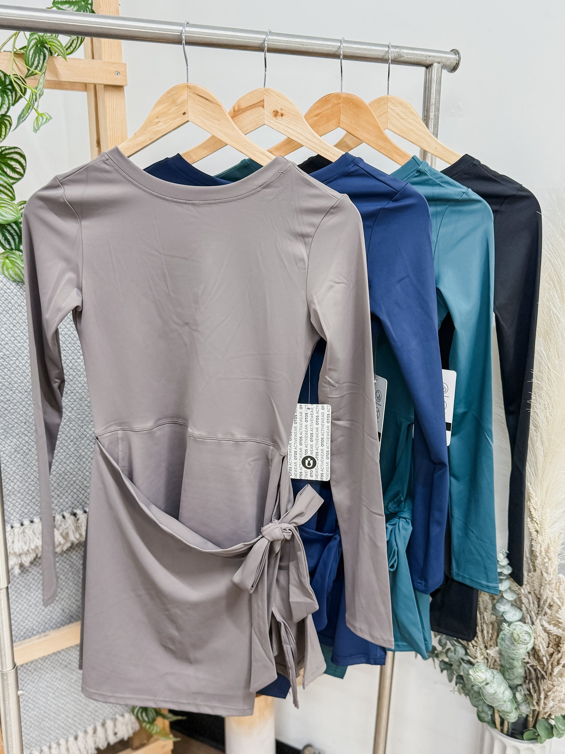 Long sleeve dress with scoop back and side tie. Has built in shorts with side pocket.