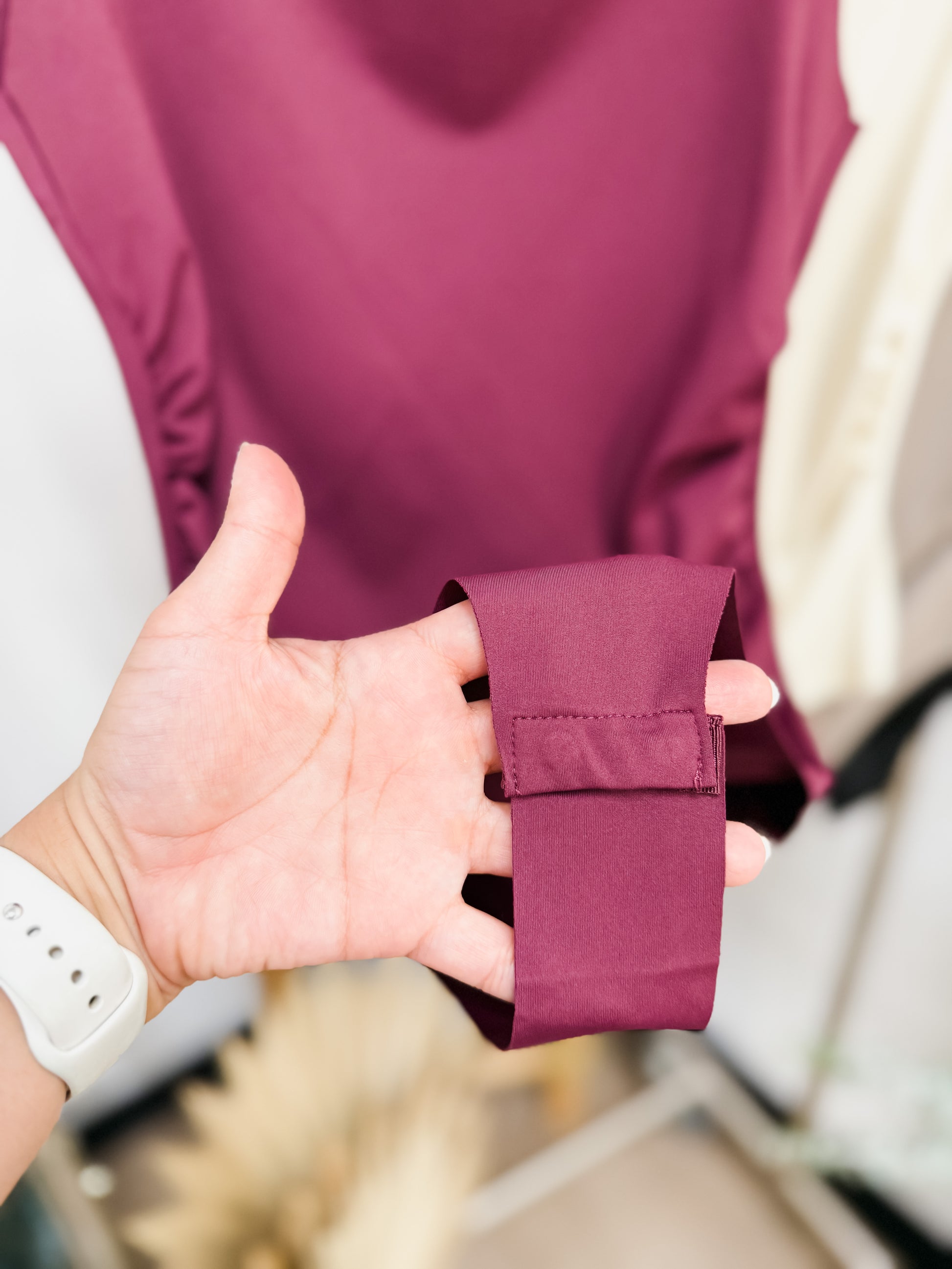 Sleeveless ruched bodysuit in super stretch laser cut fabric. Has snap button closure.