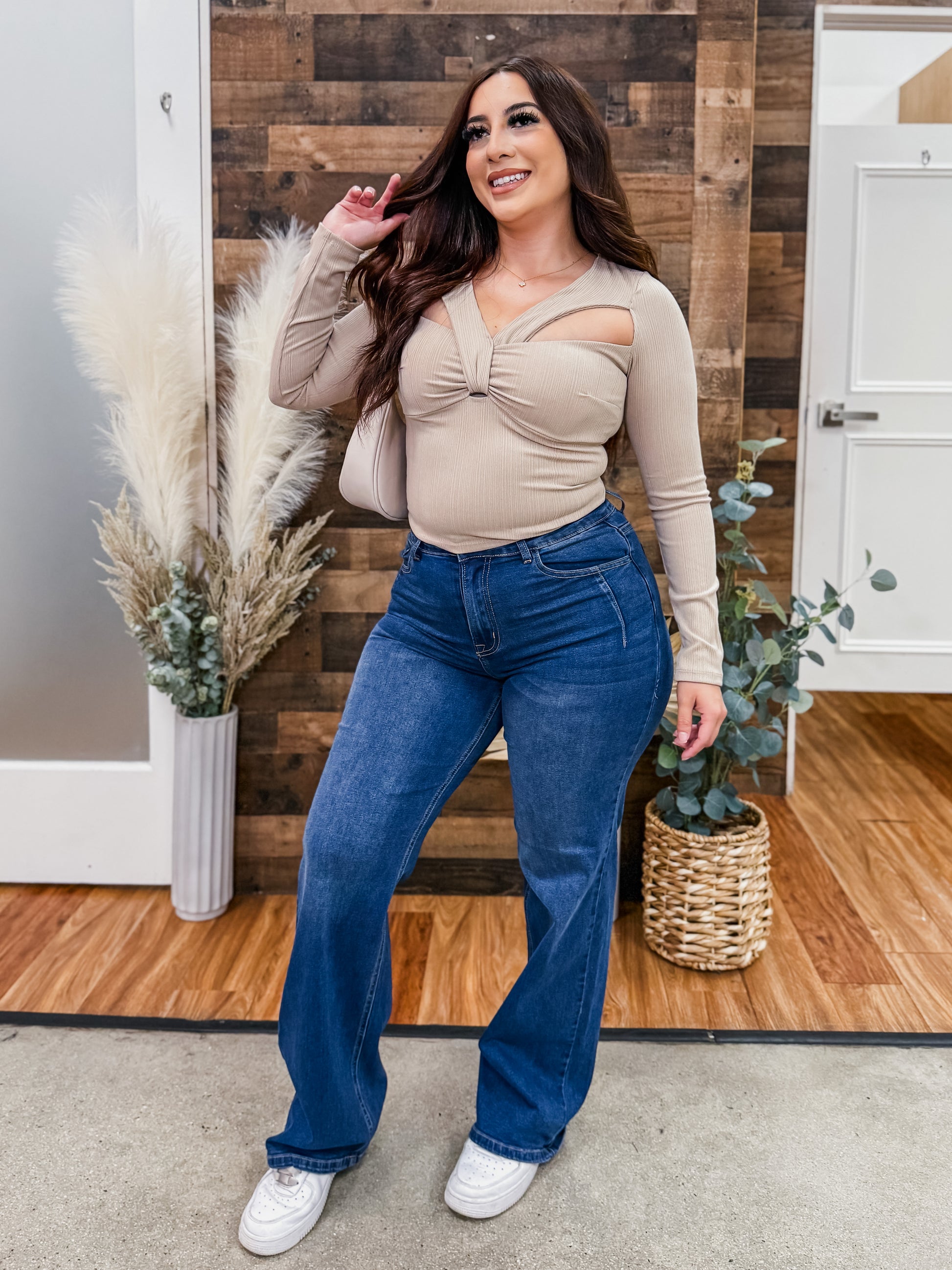 Ribbed long sleeve top with cutouts at neckline. Has build in padding.