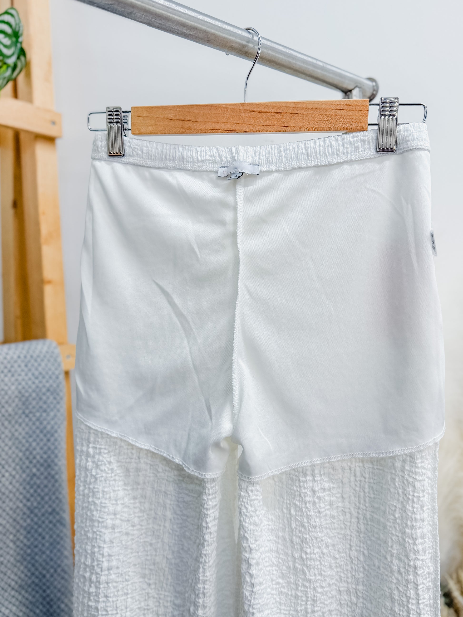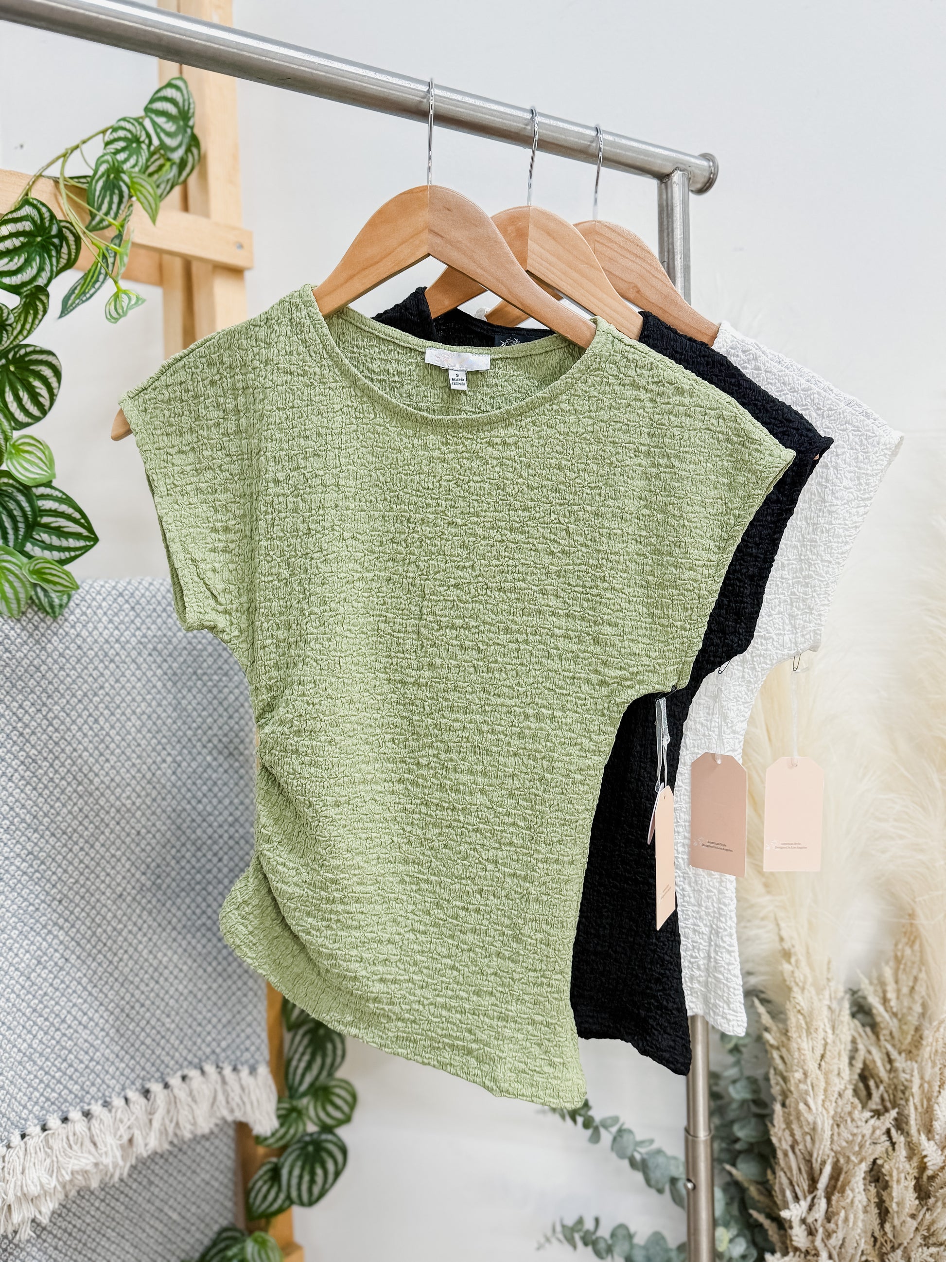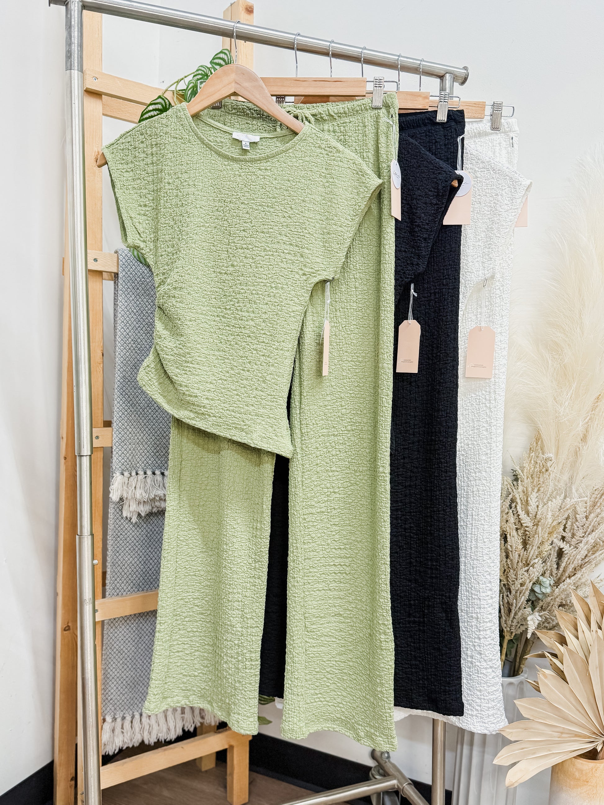 Effortless style meets comfort in this fun two-piece set! The asymmetrical short-sleeve top pairs perfectly with straight-leg pants featuring an elastic tie waist for an adjustable fit. Crafted from lightweight stretch crinkle fabric, this matching set moves with you all day while keeping things breezy and chic. Perfect for casual outings or relaxed weekend vibes.