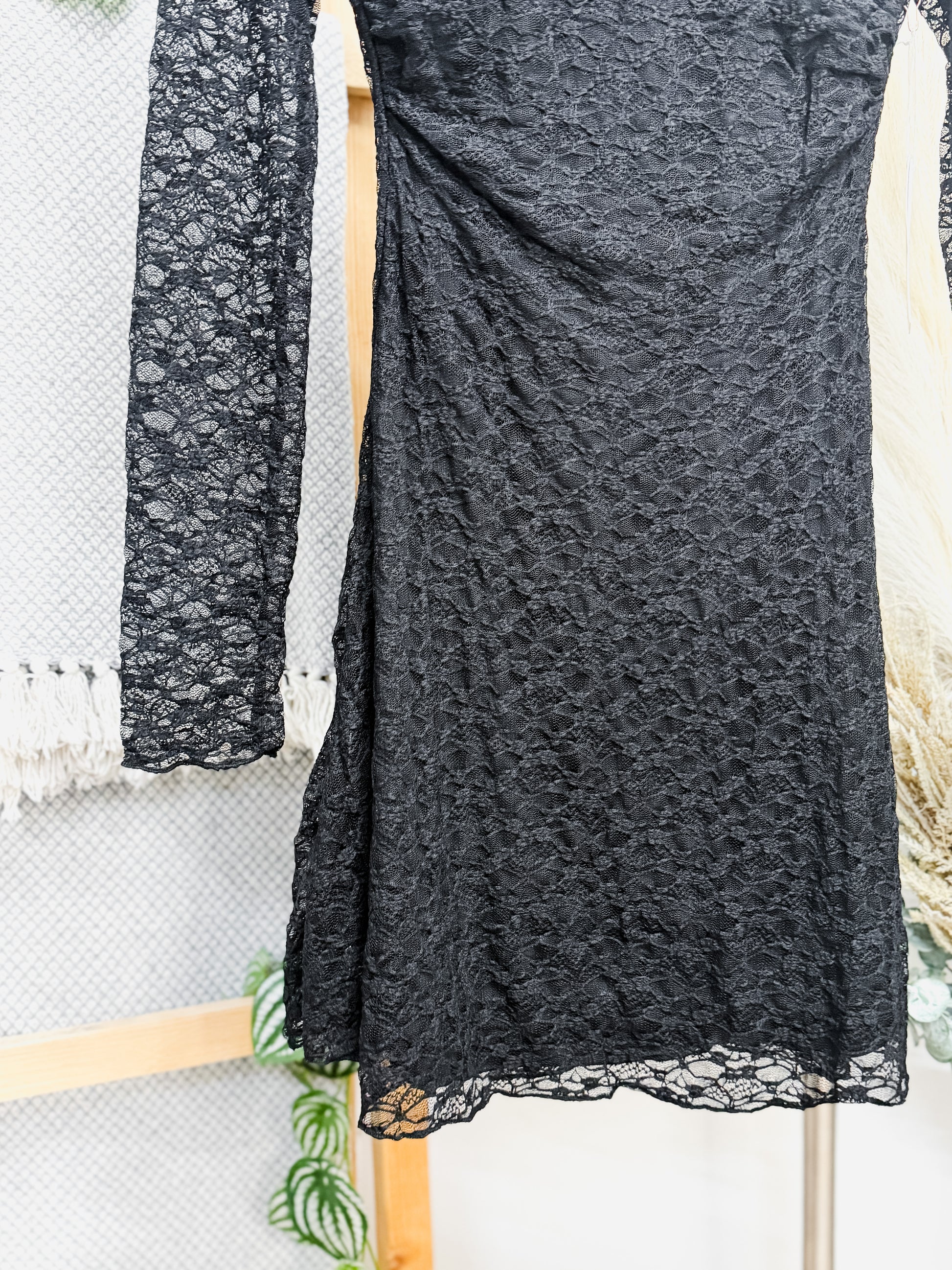 Lace boat neck cinched waist dress with slight flare skirt. Stretch material. Has lettuce hems. Bodice is fully lined.