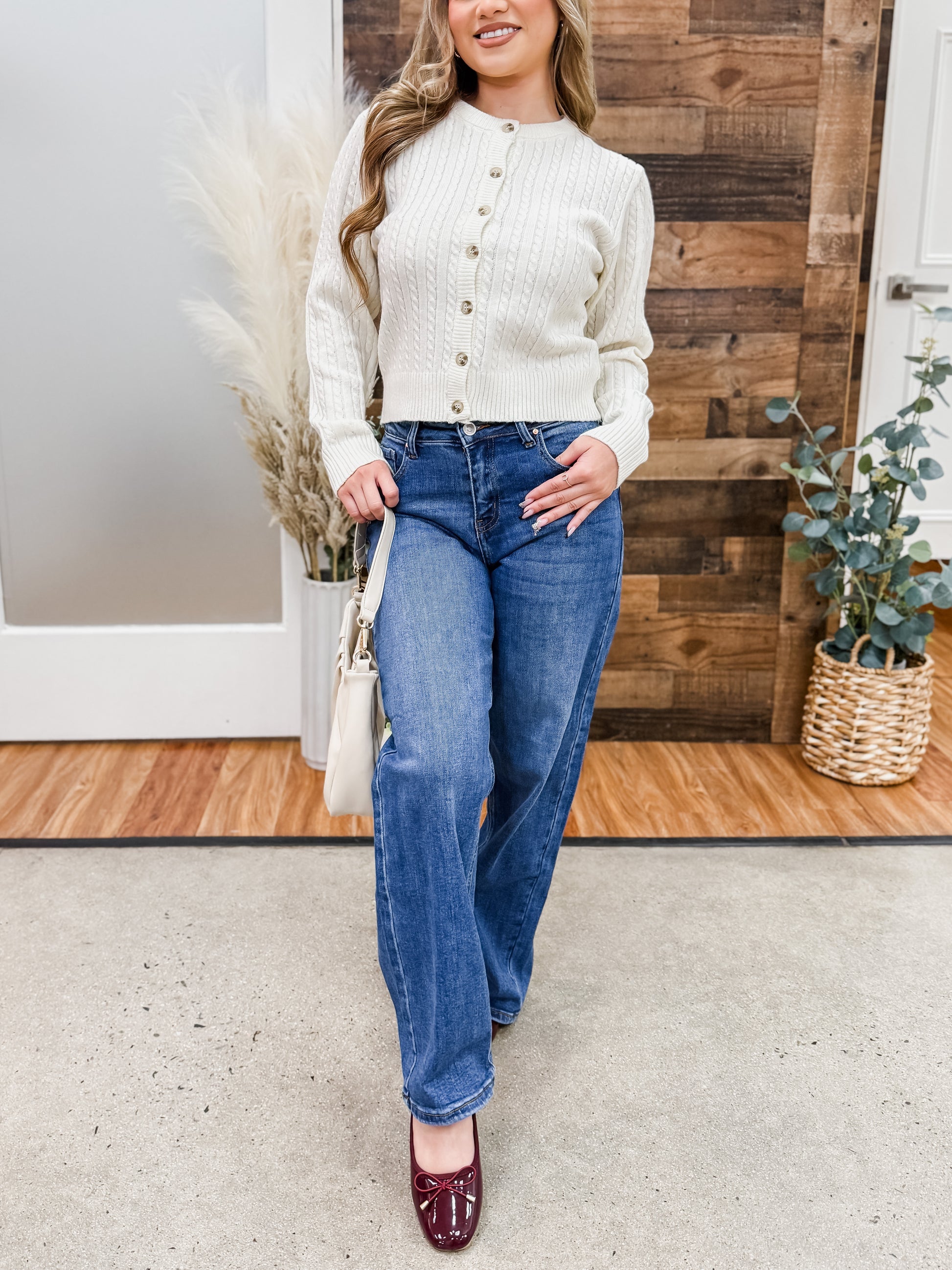 Meet the Margot Cable Knit Cardigan—a fitted essential with timeless cable knit texture and a classic round neckline. Layer it over anything for instant style and warmth. Your new favorite piece for effortless, cozy-chic looks.