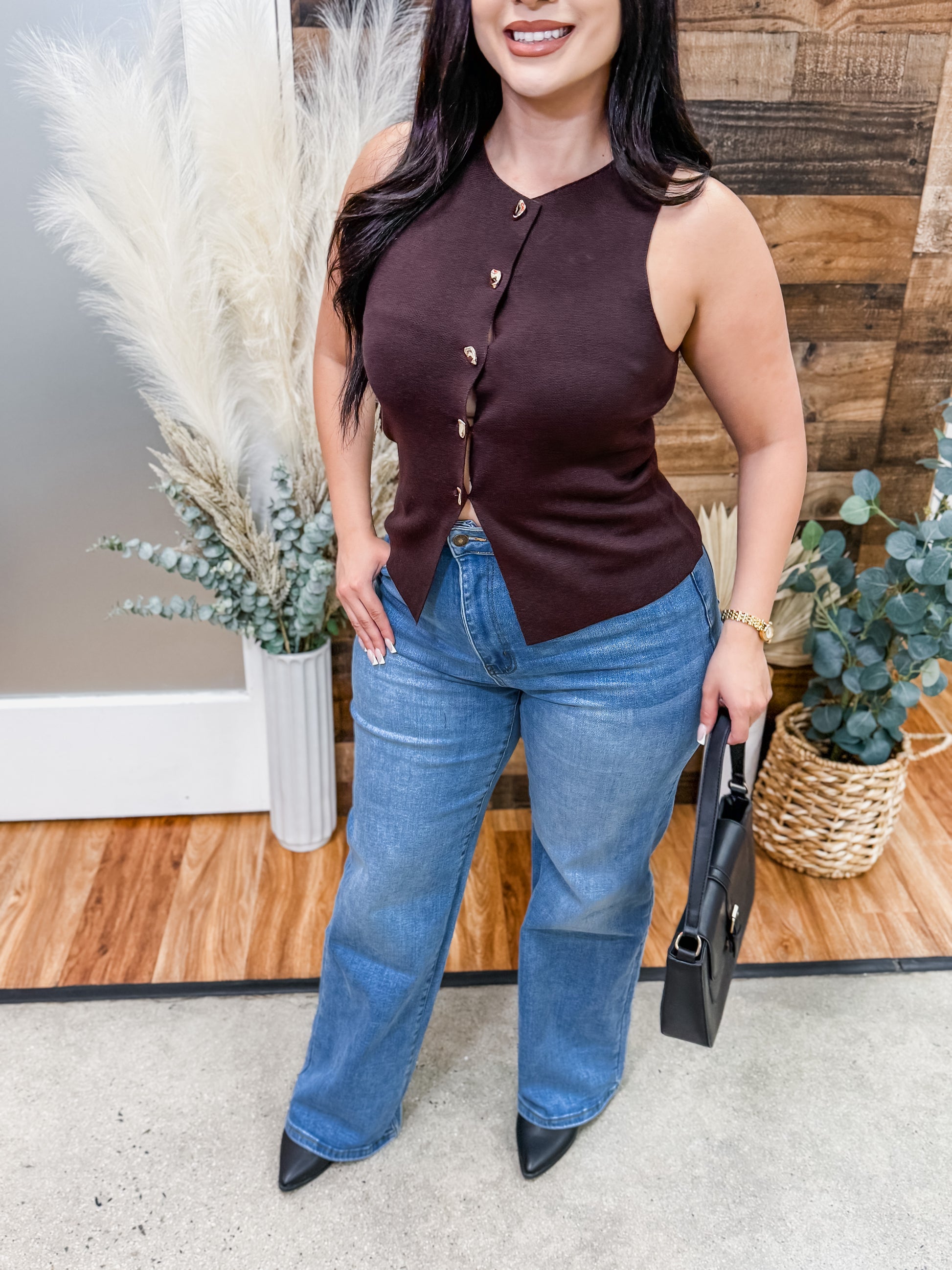 Sleeveless regular length top in thick knit fabric. Round neck. Has gold button.