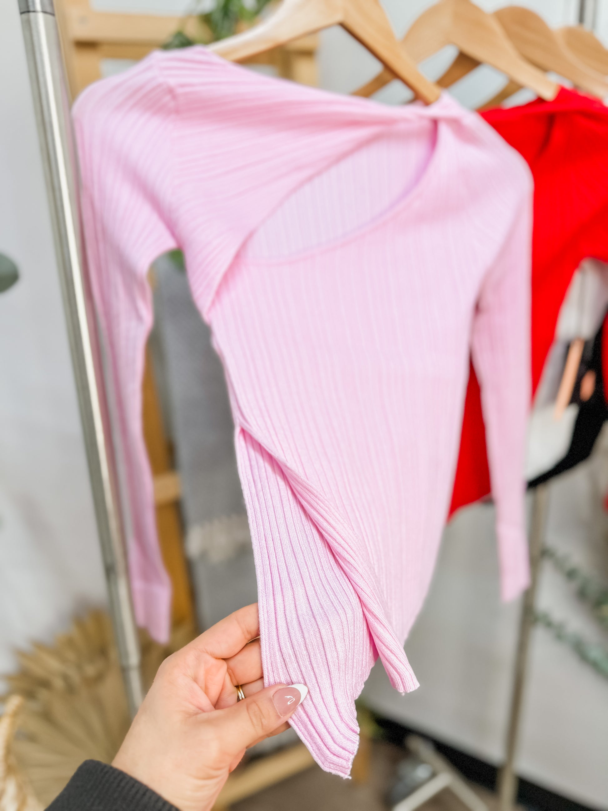 The Monica Sweater is a playful ribbed knit top with a trendy open neckline and pointed side hemline. Long sleeves, breathable fabric, and effortless style make it perfect for layering or wearing alone.