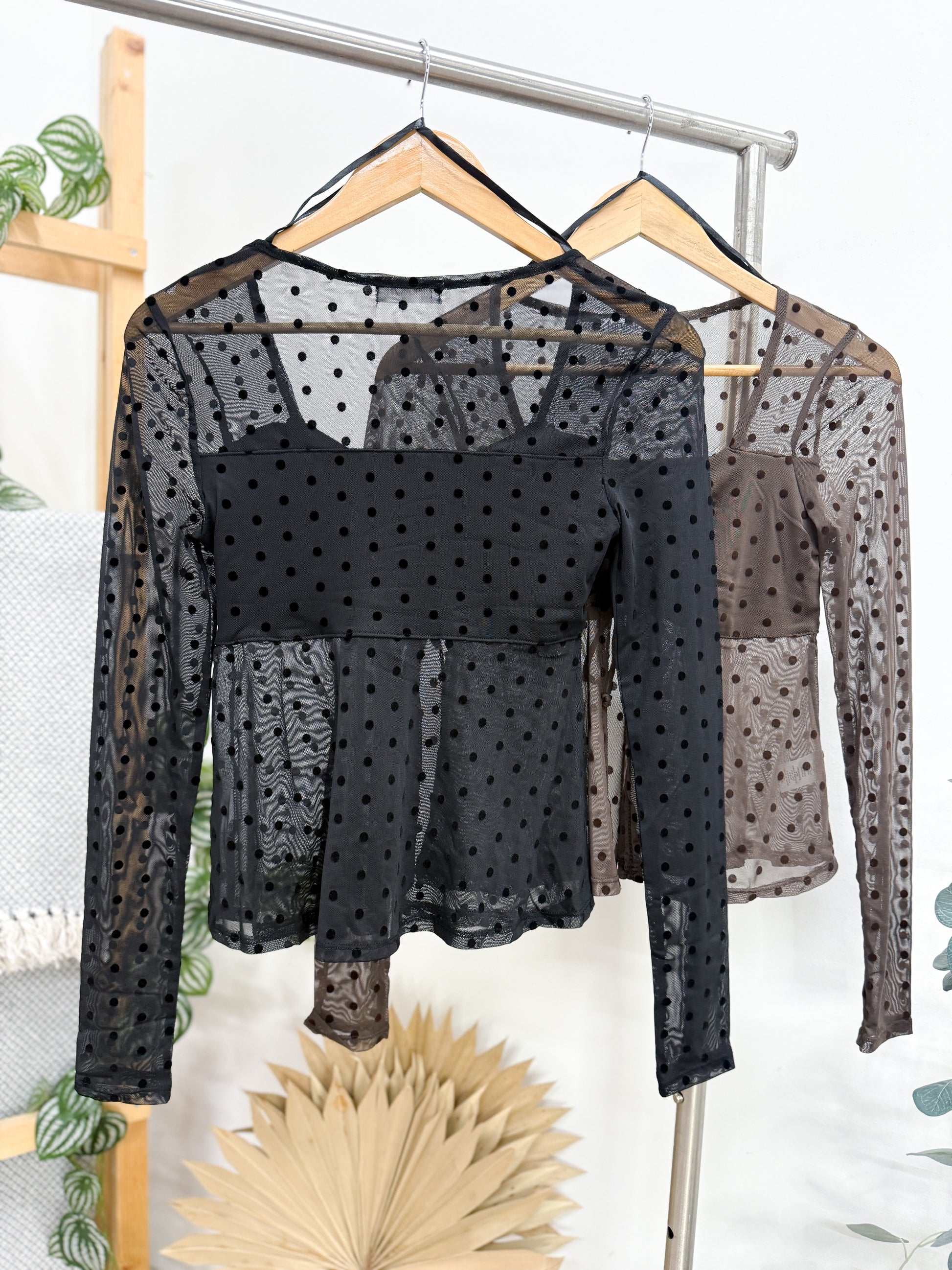 Dainty polka dot mesh sheer fabric top with adjustable front ties. Bust area is lined and not sheer. Long sleeves scoop neckline. Flares out.