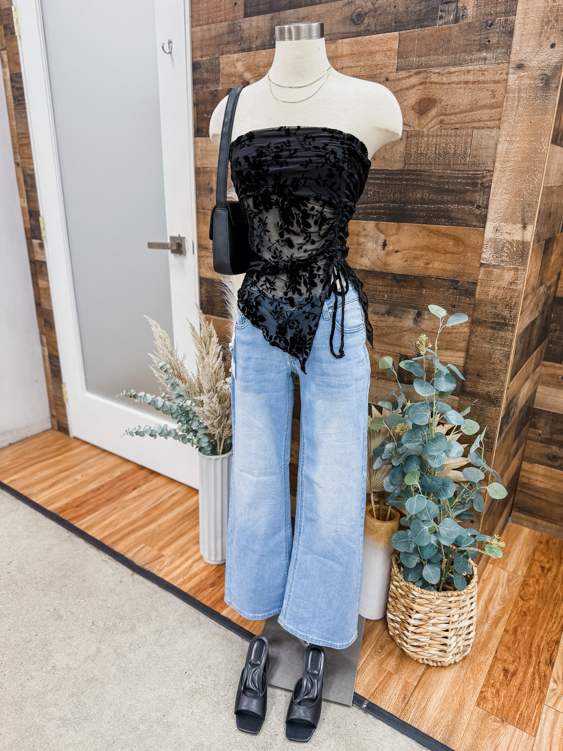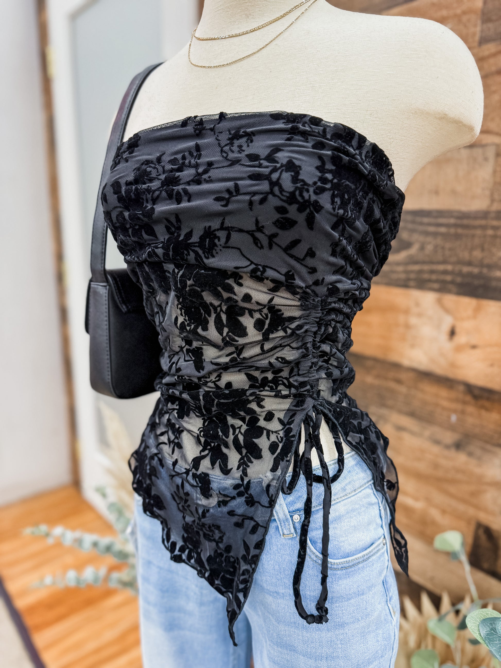 Strapless top with adjustable side tie. Has velvet burnout flower print design. Sheer fabric at bodice.