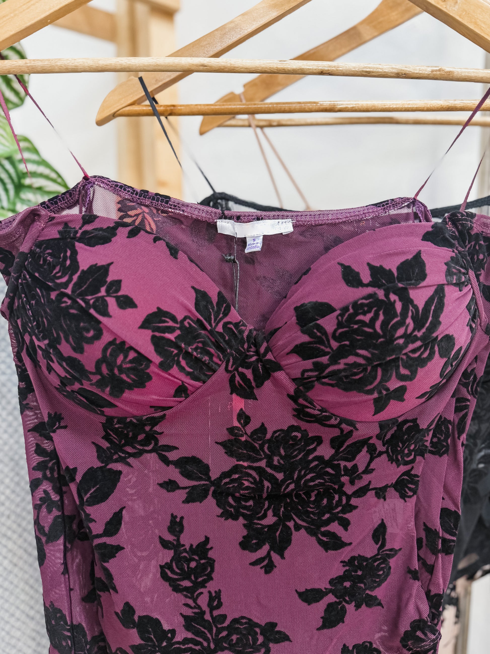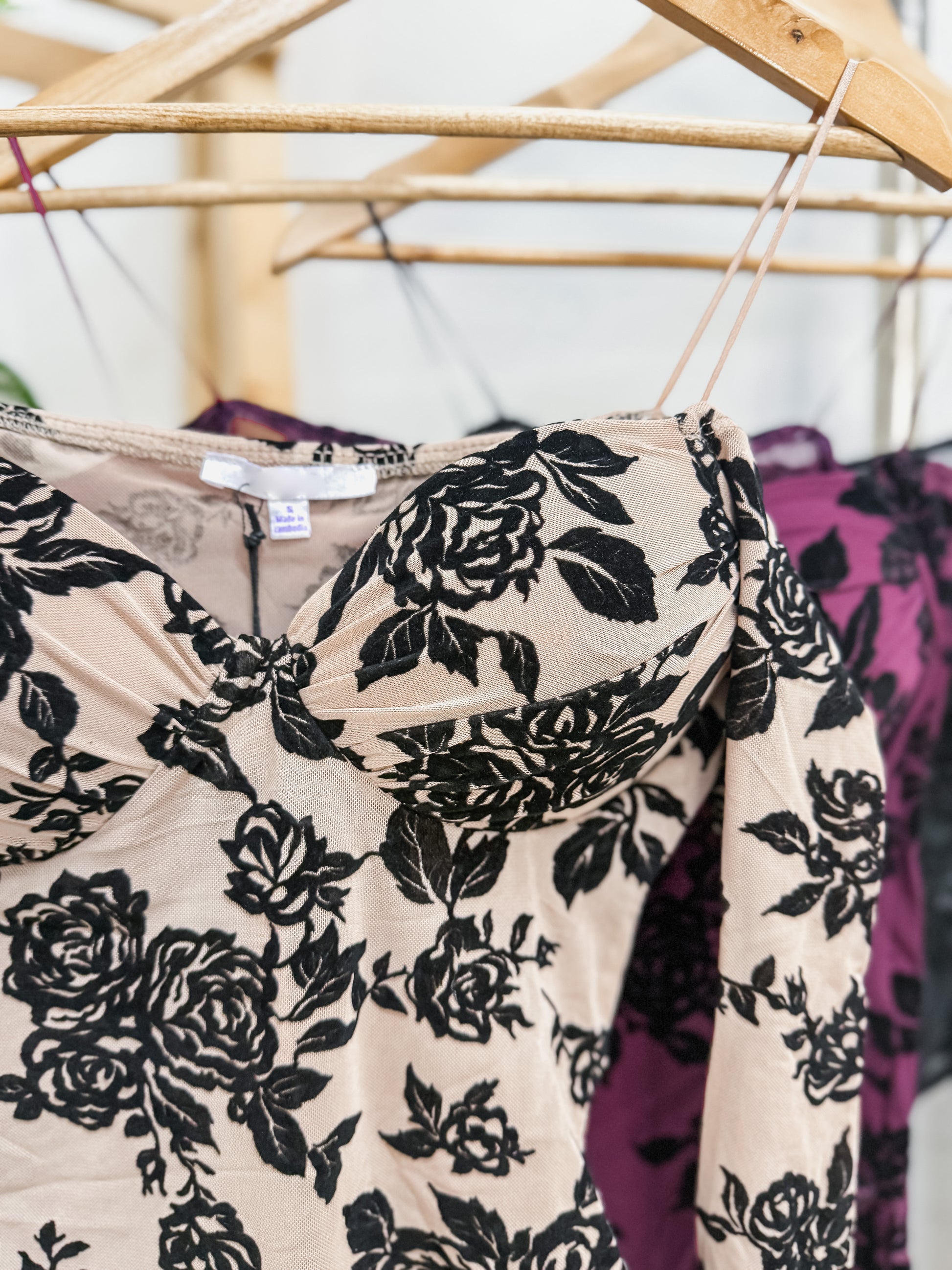 Off the shoulder long sleeve bodysuit. Sheer material with velvet roses throughout. Has built in cups with padding.