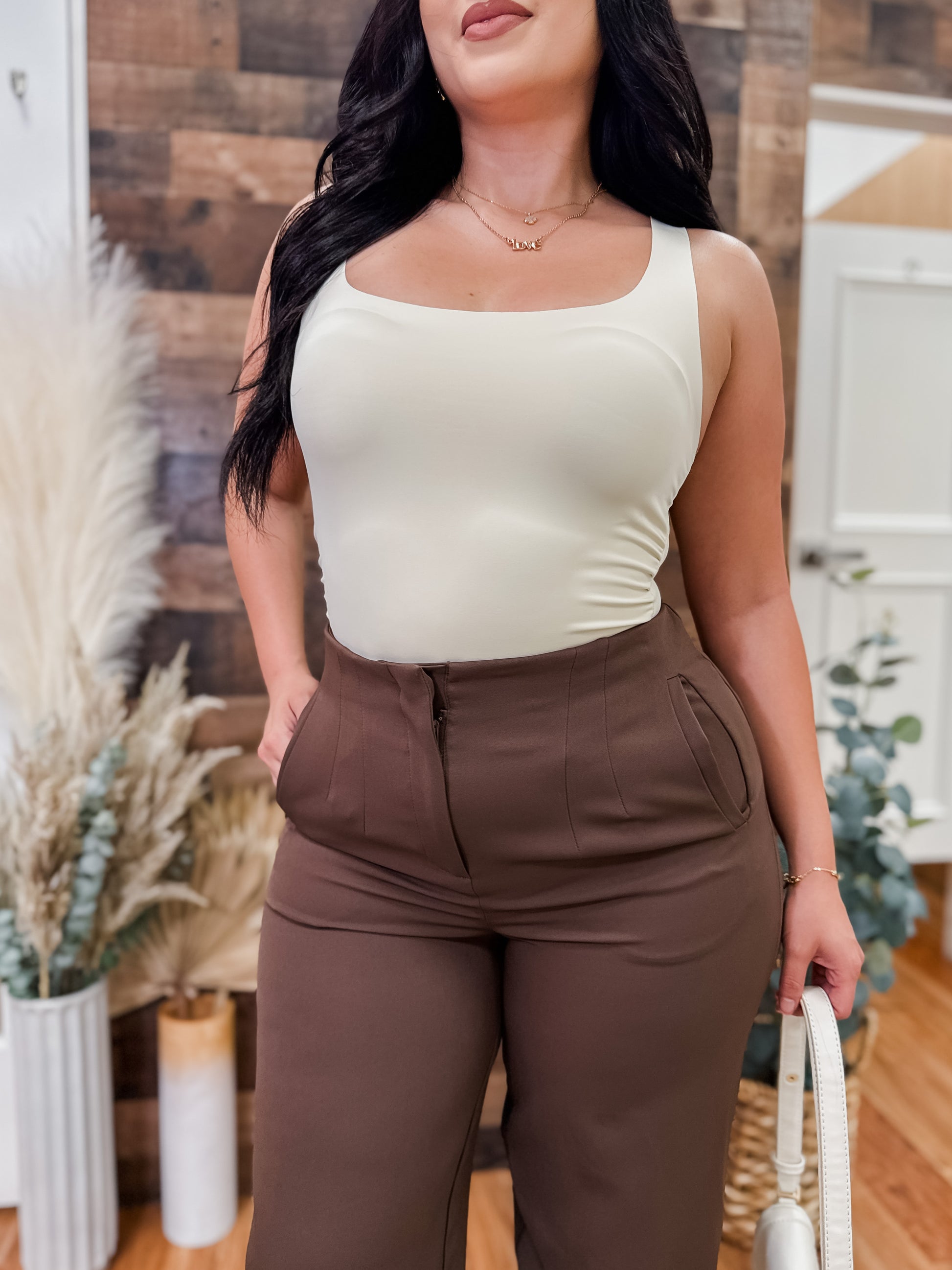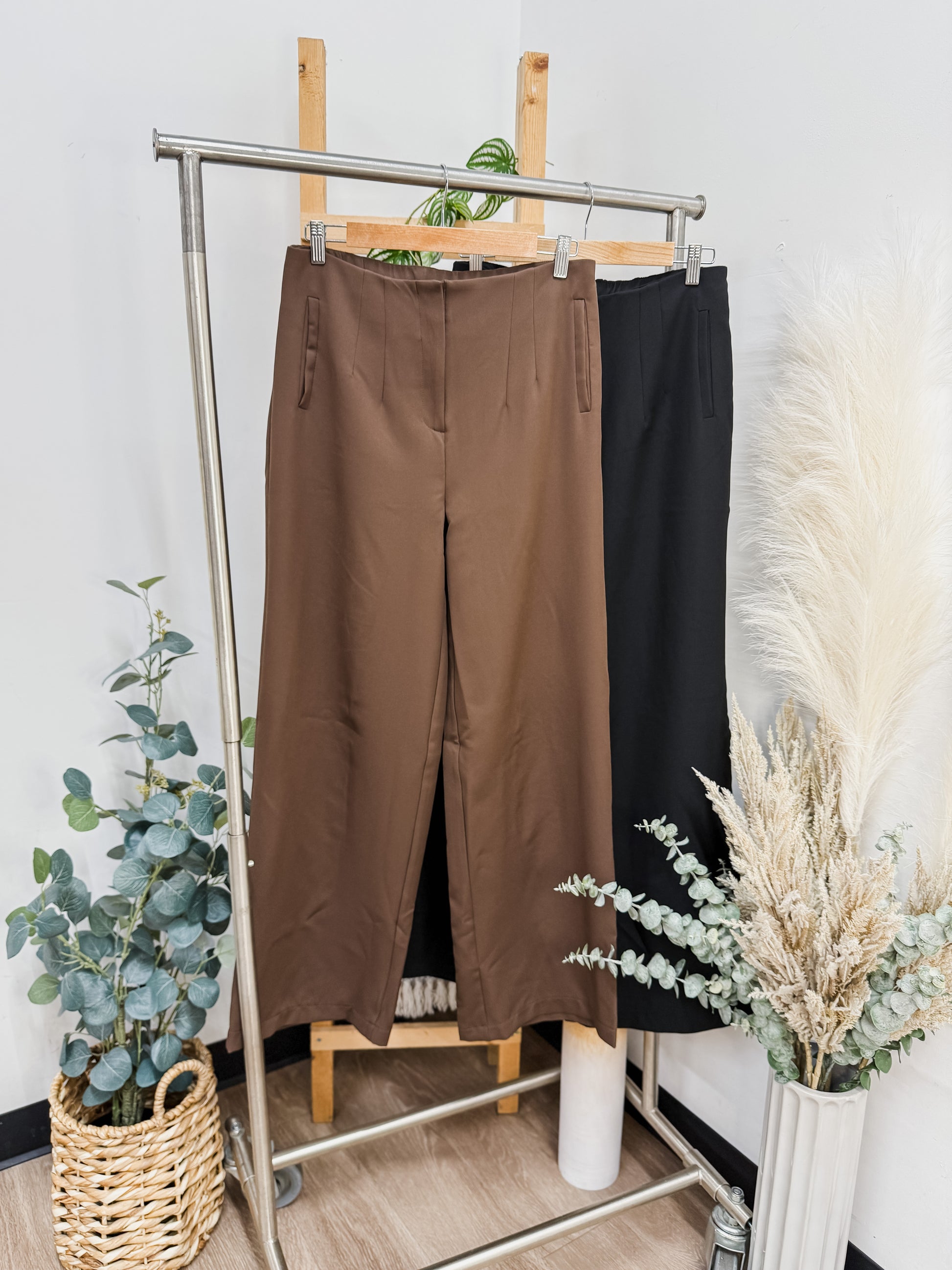 High waisted pants with darts at waist. Trouser loose wide leg style.