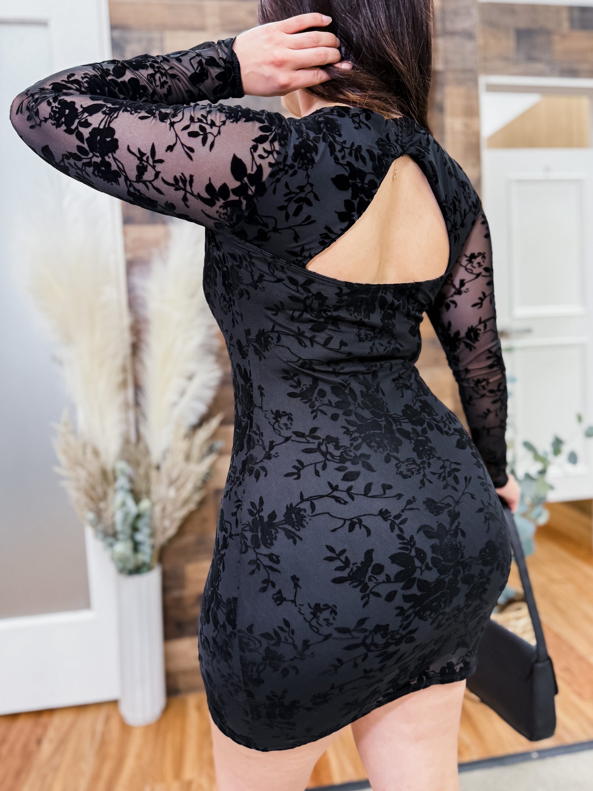 Floral velvet burnout dress. Long sleeve with round neckline. Bodycon & mini style.